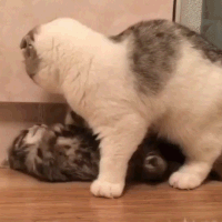 毛繕いをしてあげるって、にゃんこ界では最高の愛情表現♪ まだまだ体が小さい弟への愛が止まらないようです。 遊びたい盛りの子猫ちゃんはどうにか逃げ出そうと奮闘しますが、お兄ちゃんの愛は想像以上に無限大なのでした!!